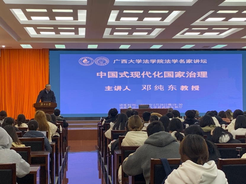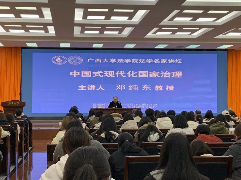 2月28日,第十三届全国政协委员、全国政协社会和法制委员会委员、中国政策科学研究会副会长邓纯东应邀在君武馆玉林厅作主题为“中国式现代化国家治理”的讲座。本次讲座由太阳集团城网站2017院长许光耀主持,太阳集团城网站2017本科生、硕士研究生参加了此次讲座。
