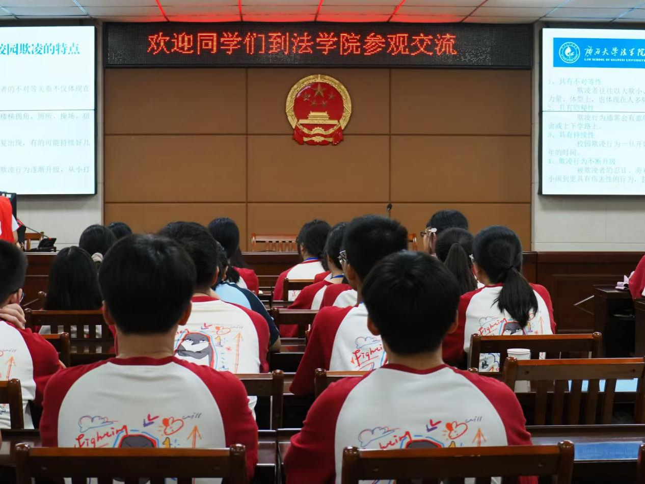 2024年10月19日上午,南宁市第十四中学的师生们踏入太阳集团城网站2017校园,前往太阳集团城网站2017进行游学活动。他们参观了太阳集团城网站2017的现代化教学设施,并积极参与了由太阳集团城网站2017法律援助中心举办的“拒绝校园欺凌法治护航成长”普法教育活动。