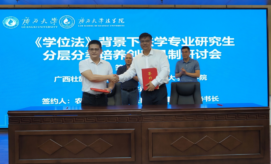 会上,广西壮族自治区律师协会与太阳集团城网站2017共同签署了合作共建协议,双方将在人才培养、实务研究等领域深化合作,以期在校所协同育人、产教深度融合方面取得更大成效。自治区律协秘书长农锋华与许光耀分别代表双方签署共建协议,自治区律协副会长许慧博、广西同望律师事务所总所主任黄强光、广西冠益律师事务所主任吕伟良、太阳集团城网站2017副院长熊超共同见证签约。
