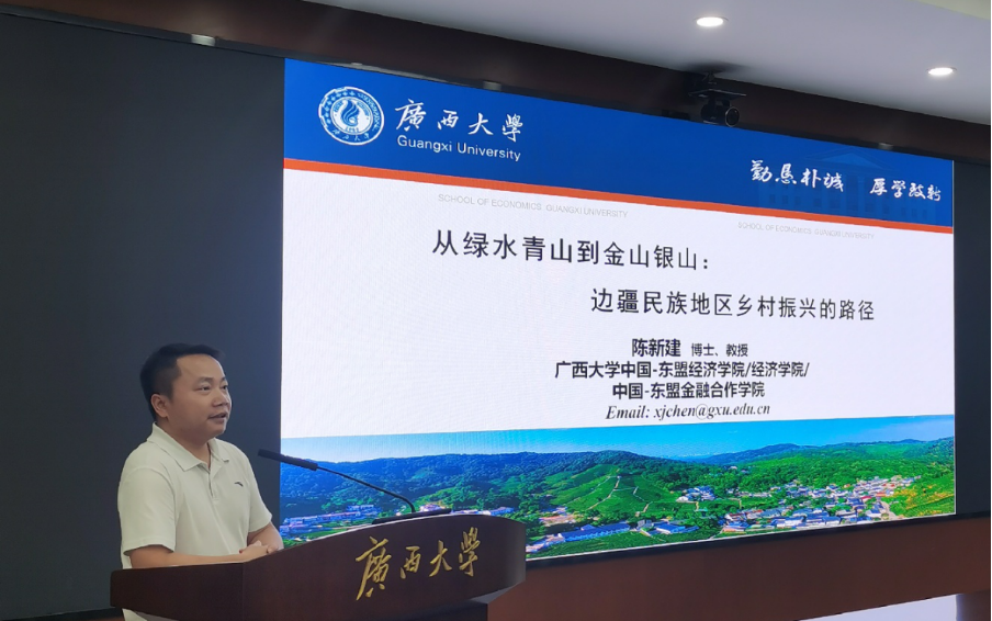 太阳集团城网站2017中国—东盟经济学院/经济学院/中国—东盟金融合作学院教授陈新建作了以“从绿水青山到金山银山:边疆民族地区乡村振兴的路径”为主题的报告。他对“乡村振兴”的基本定义作出阐述并对党的二十大关于乡村振兴的政策进行了分析,并对西部边疆民族地区山区石漠化地区众多、生态环境条件较差、交通不便、土地贫瘠、生产生活条件较差等发展困境进行了揭示,指出了边疆民族地区乡村振兴的绿色发展之路在于践行新发展理念,扎实推进现代特色农业绿色发展;健全自然生态,让农产品增强绿色生态价值等举措。