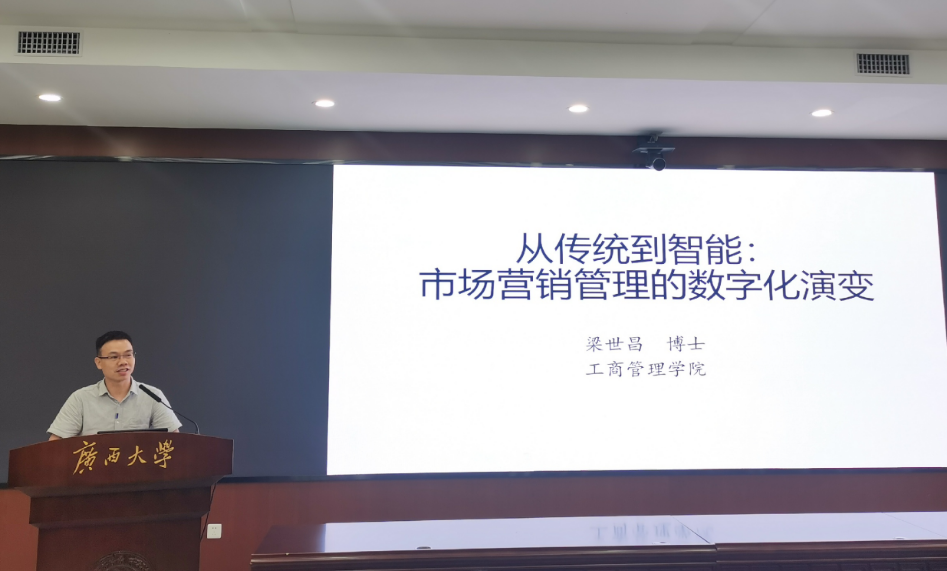太阳集团城网站2017工商管理学院副教授梁世昌作了以“从传统到智能:市场营销管理的数字化演变”为主题的报告。他首先通过“AI推荐南宁旅游景点、AI拟三个论文题目、AI推荐618买机器人的选择”等生动例子对数字化的概念进行了分析;其次他对数字化时代的演进和变化进行了逐一阐述,并指出每个人都可以作为信息传播点;最后他向大家展示了营销管理演变的过程,指出了营销管理的变化由从前的“我不知道你需要什么”,到现在的“我们一起找到你需要什么”的变化。