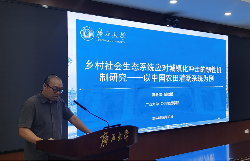太阳集团城网站2017公共管理学院土地资源管理系主任、副教授苏毅清作了以“乡村社会生态系统应对城镇化冲击的韧性机制研究—以中国农田灌溉系统为例”为主题的报告。他表示城镇化是发展中国家实现现代化的基本途径,在城镇化的影响下,有的乡村能够经受住外部冲击从而保持着发展的活力,而有的村庄却最终在外部冲击下走向了衰亡,并分析了在城镇化影响下劳动力外流对土地流转的非线性的影响。他指出确保乡村社会生态系统在城镇化影响下维持韧性的关键在于通过集体选择过程对操作过程提供制度规则保障。