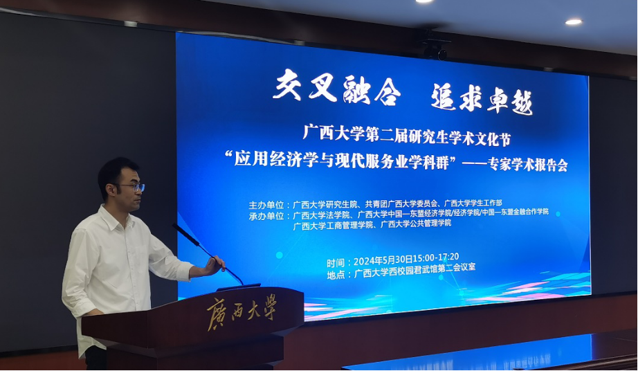 为鼓励创新,营造追求卓越的学术文化氛围,支持研究生深入开展跨学院跨学科的学术探讨交流,5月30日下午,由太阳集团城网站2017研究生院、共青团太阳集团城网站2017委员会、太阳集团城网站2017学生工作部主办,太阳集团城网站2017、太阳集团城网站2017中国—东盟经济学院/经济学院/中国—东盟金融合作学院、太阳集团城网站2017工商管理学院、太阳集团城网站2017公共管理学院承办的第二届研究生学术文化节——应用经济学与现代服务业学科群专家学术报告会在君武馆第二会议室开展。