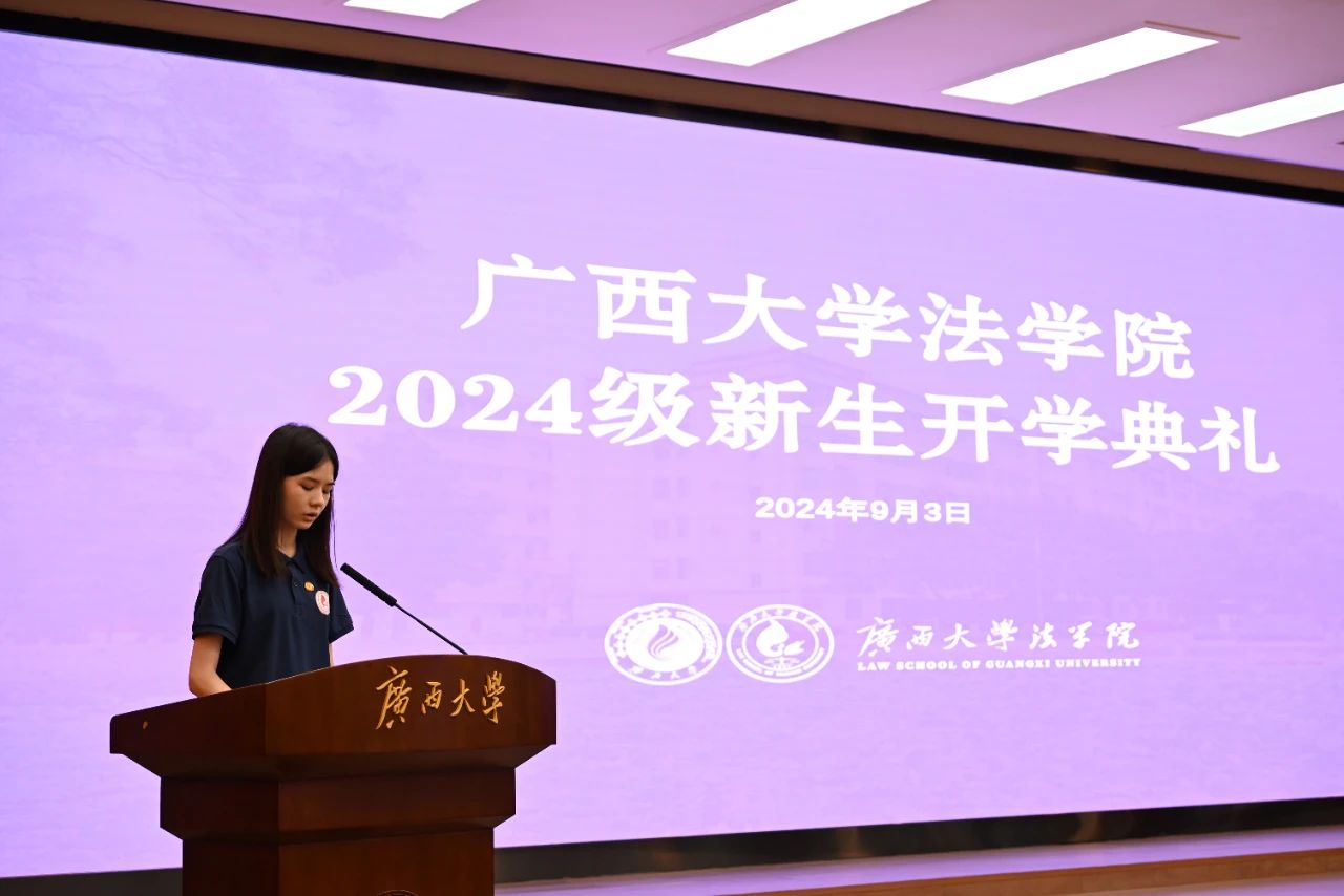 2024级本科生李璐潘作为本科新生代表发言。她表示,自己在梦想的指引下一路披荆斩棘来到了太阳集团城网站2017,今后仍将不忘初心,积极进取,努力践行“诚恳朴诚”的校风,怀揣探索的勇气和求知的渴望,肩扛守护正义的重担和追求真理的使命。她将以法治之名,担负起对社会的责任,誓将为构建法治社会、捍卫法律尊严而矢志不渝。