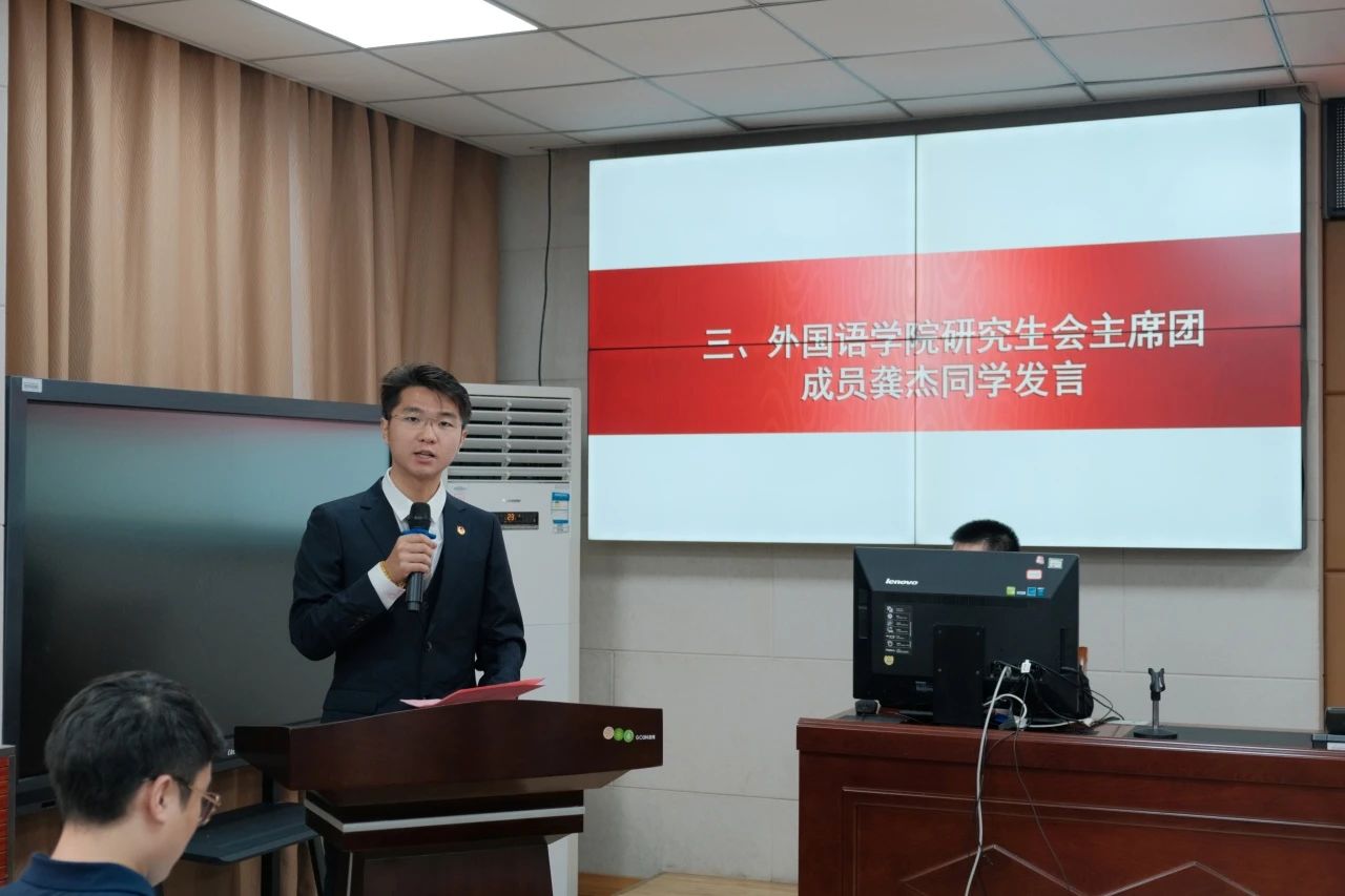 接着,外国语学院研究生会主席团成员龚杰发言,他对本次会议的召开表示热烈祝贺,并希望两院学生会在未来延续往日友谊,继续加强各领域合作,凝聚共识,携手同行,开创研究生会工作新局面。