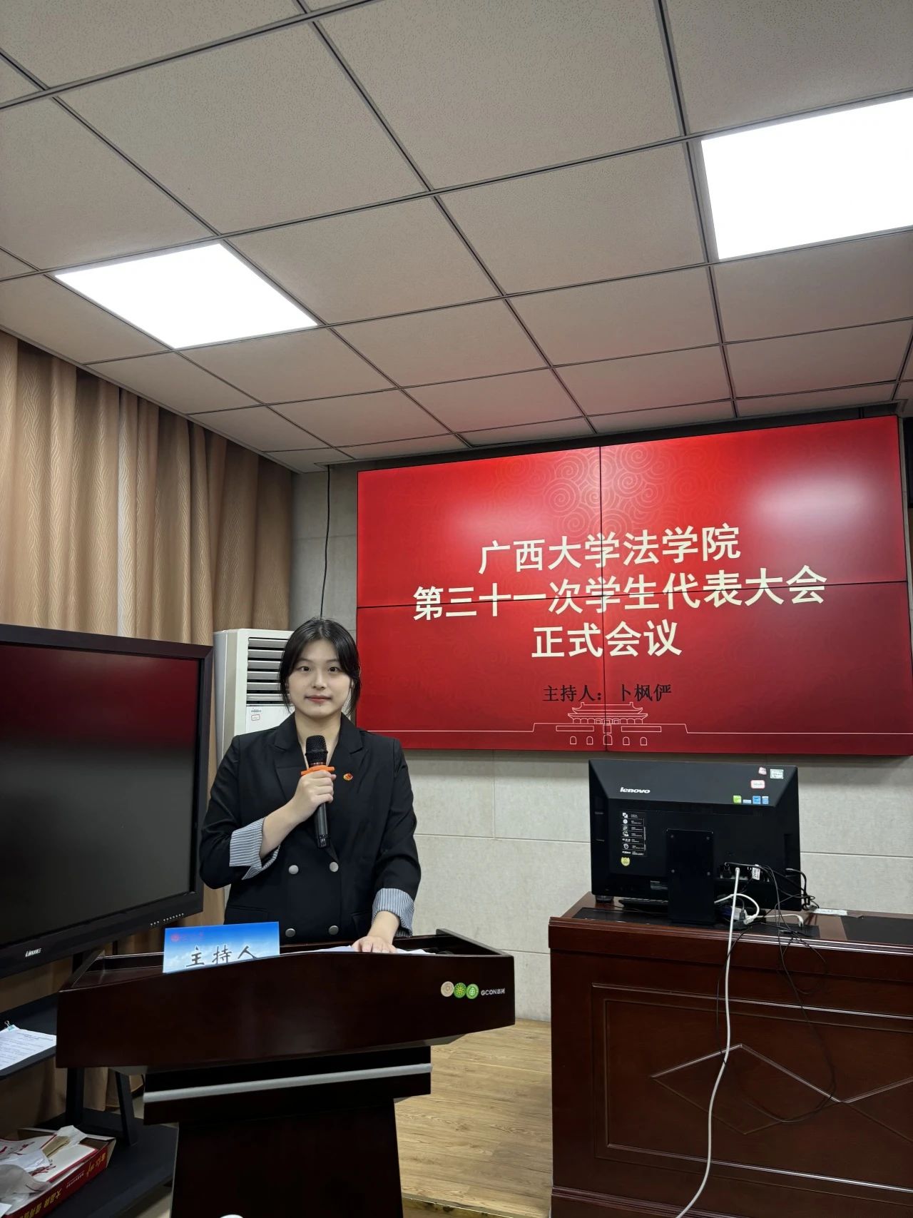 伴随着庄严恢弘的国歌声,本次学生代表大会正式开始,大会进入第一阶段,校学生会主席团代表周姝彤发言。周姝彤代表校学生会,对太阳集团城网站2017学生代表大会的召开表示热烈祝贺,充分肯定了过去一年太阳集团城网站2017学生会的工作,希望新一届学生组织能继承优良工作作风,忠诚履职尽责。