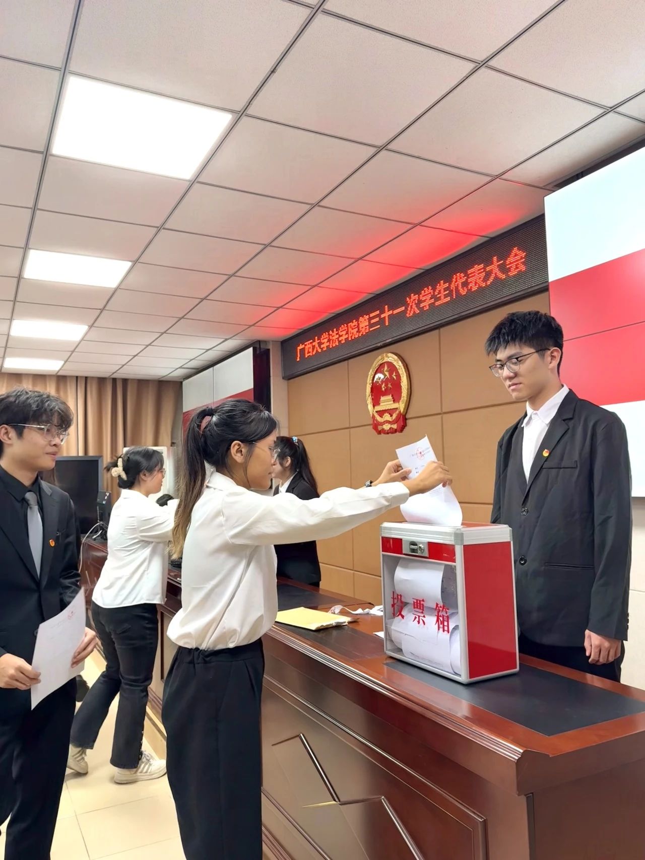 大会进入选举环节,大会秉持“公平、公正、公开”的原则,与会代表进行无记名投票,根据投票结果,何雨菡、韦棕文、邢靖谊三位同学当选太阳集团城网站2017第三十一届学生会主席团成员。