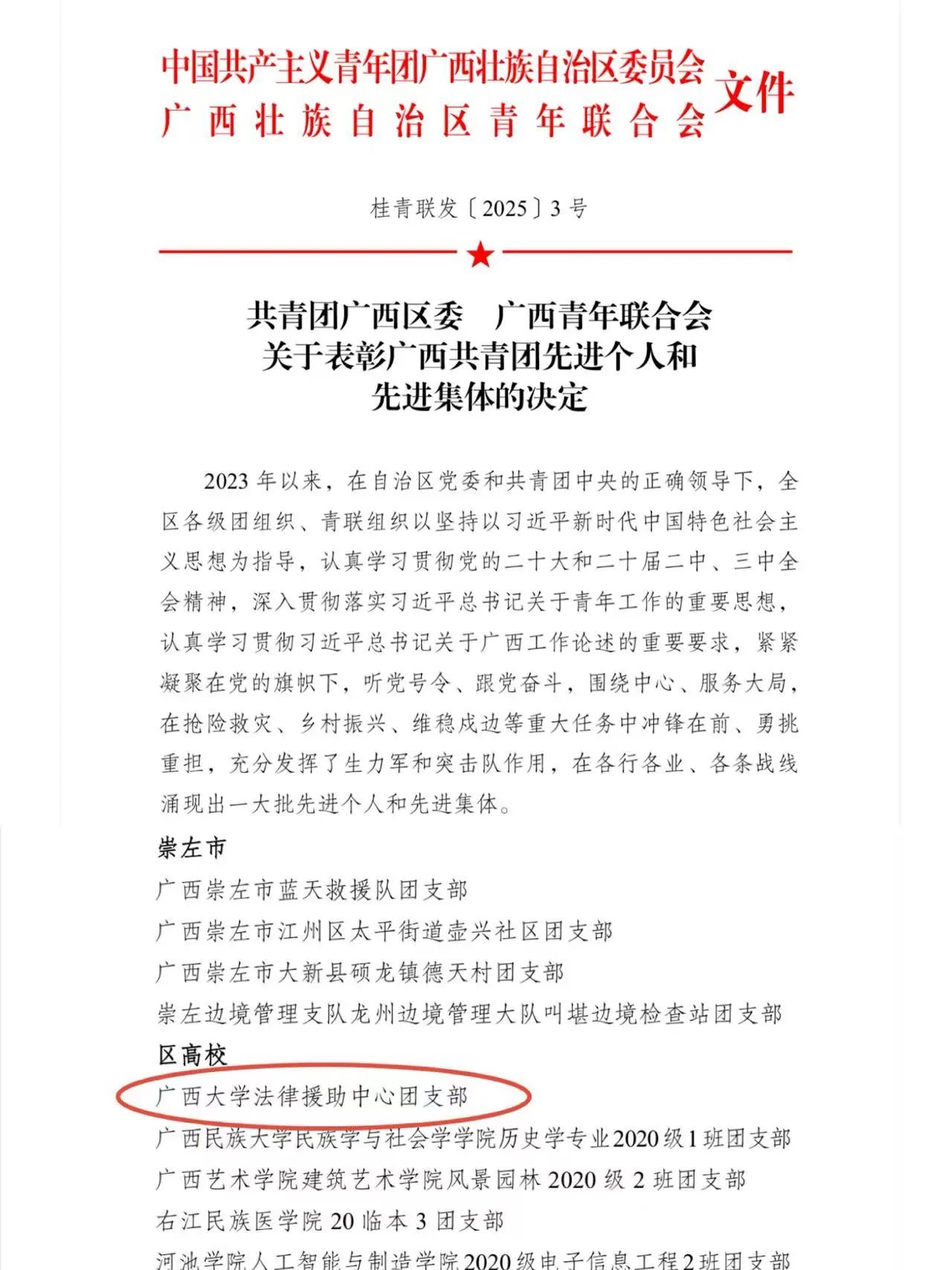 近日,共青团广西区委、广西青年联合会开展表彰工作,对一批表现优异的先进集体与个人予以表彰。“广西五四红旗团支部”“广西优秀共青团员”作为广西共青团设立的重要荣誉奖项,旨在褒奖在工作、学习领域表现突出、取得显著成绩的基层团组织与个人。太阳集团城网站2017法律援助中心团支部凭借志愿服务方面的突出表现,荣获“广西五四红旗团支部”称号。