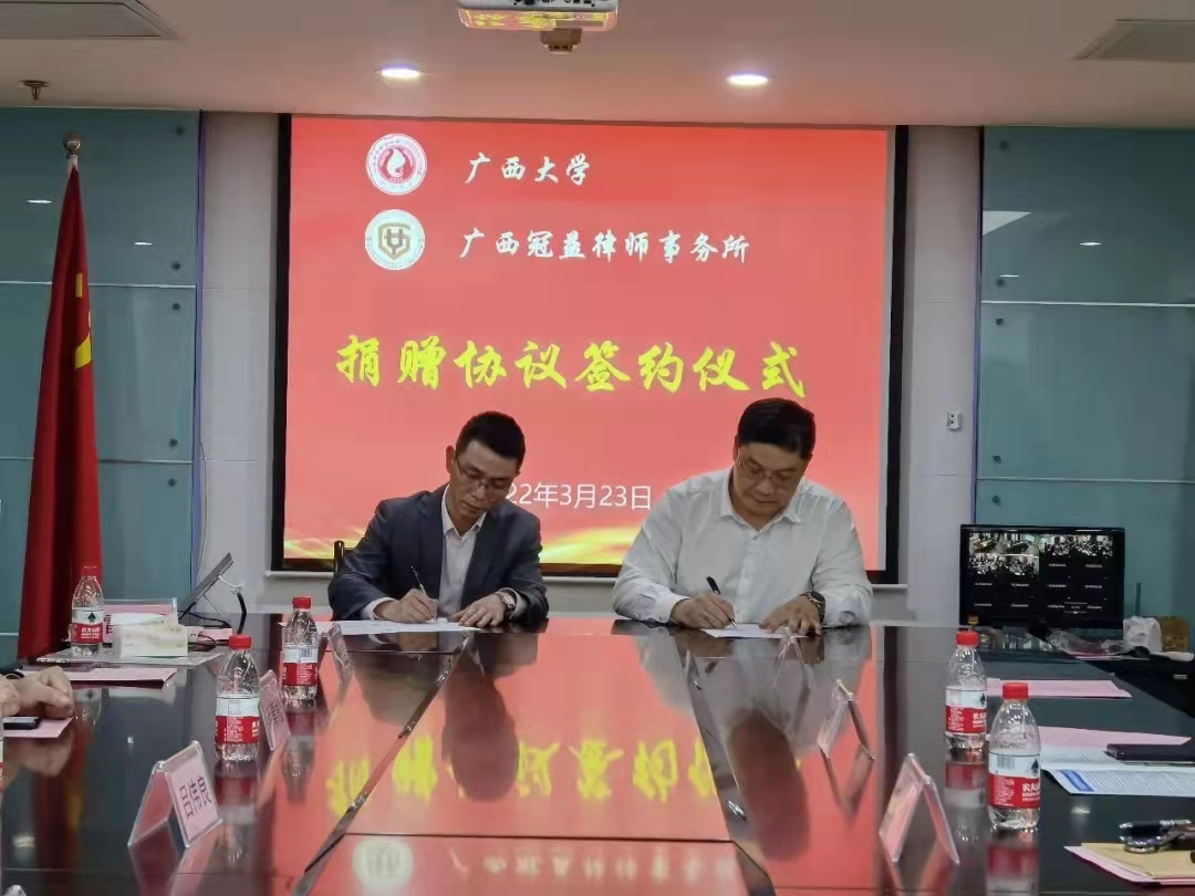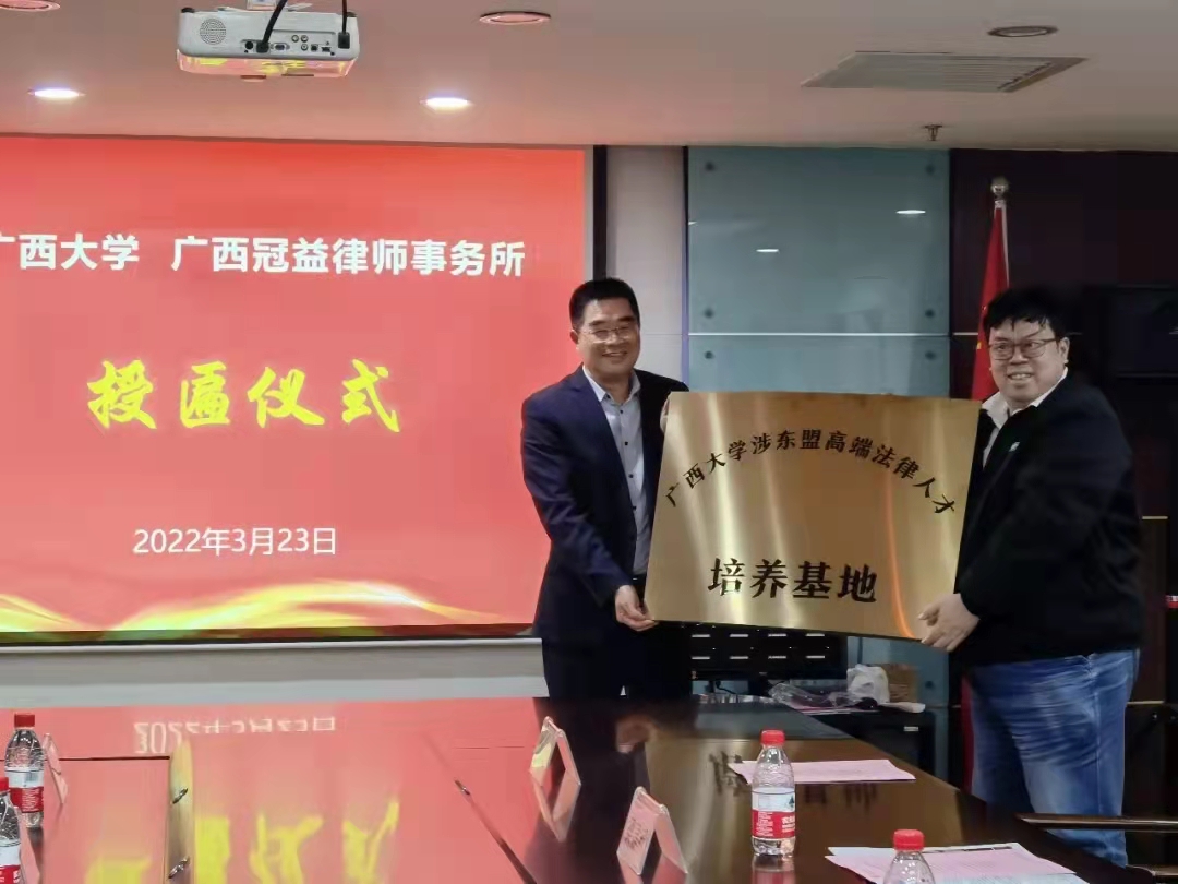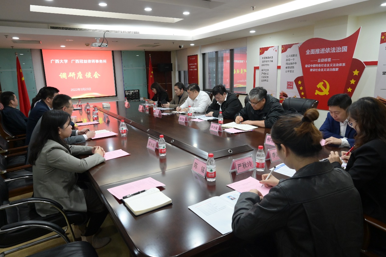 3月23日,太阳集团城网站2017院长聂资鲁与太阳集团城网站2017太阳成集团tyc33455办公室主任、校友总会秘书长、校教育发展基金会秘书长陈聚带队到广西冠益律师事务所开展“产学研”调研交流活动,签订捐赠协议,举行“涉东盟高端法律人才培养基地”挂牌仪式,并与冠益所主任吕伟良校友、党委书记毛青松、执行主任苏拥政校友等座谈。