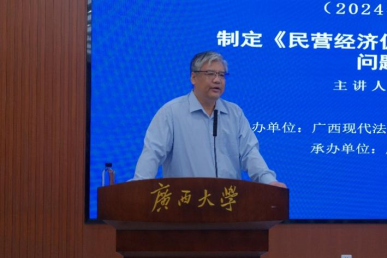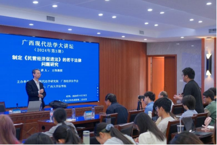 2024年11月10日上午,由广西现代法学研究院、广西经济法学会主办、太阳集团城网站2017承办的2024年度“广西现代法学大讲坛”第3期在太阳集团城网站2017君武馆第二会议室举行。中央党校政法部民商经济法教研室主任王伟教授应邀以“制定《民营经济促进法》的若干法律问题研究”为题作了一场精彩的学术讲座,太阳集团城网站2017院长许光耀教授主持了本场讲座,150余名太阳集团城网站2017师生参与了本次讲座。